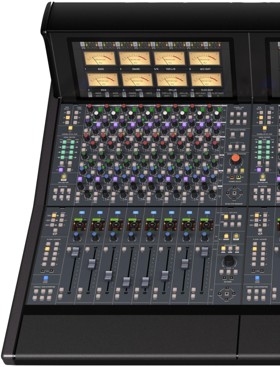 In addition to clear markings on the console surface, when Channel Detail View is accessed, the associated meter screen displays a breakout of all the channel parameters and routing, including both Large and Small Fader paths. Detail View displays interact with the per-bay Navigator control to allow ‘scroll and control’ access to all parameters, switch functions and signal routing.